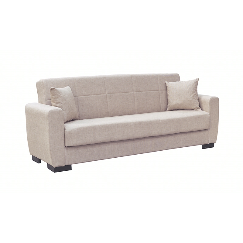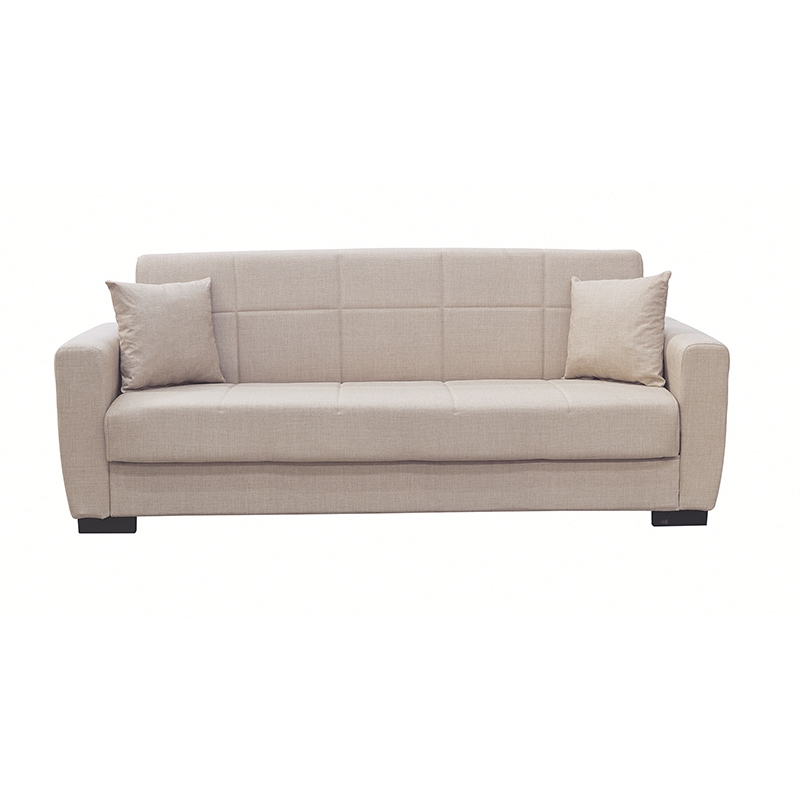Anima τριθέσιος καναπές/κρεβάτι με ύφασμα σε χρώμα light brown και καπιτονέ σχεδιασμό. Ένας κομψός και ευέλικτος καναπές, που μετατρέπεται εύκολα και γρήγορα σε κρεβάτι όταν χρειαστεί. Διαθέτει διακοσμητικά μαξιλάρια που προσθέτουν στυλ και