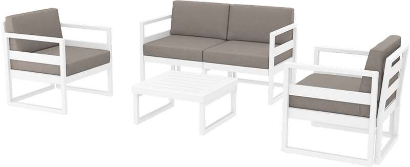 MYKONOS set του οίκου Siesta,σε χρώμα white.Το SET περιλαμβάνει 1 2θέσιο καναπέ,2 πολυθρόνες,τραπέζι και μαξιλάρια.Από υψηλής ποιότητας πολυπροπυλένιο με ενίσχυση από υαλώδεις ίνες (fiber glass) για απόλυτη αντοχή.Χωρίς μεταλλικό σκελετό για μεγαλύτερη αξιοπιστία στον χρόνο.Διαθέτει UV protection για μέγιστη προστασία από τον ήλιο ώστε να μην αλλοιωθούν τα χρώματα.Κατάλληλο για εσωτερική και εξωτερική χρήση.Πιστοποιημένο προϊόν από τον Ιταλικό οίκο CATAS.